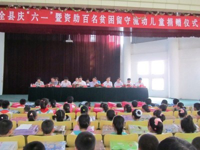 為幫助農(nóng)村貧困留守流動兒童繼續(xù)學(xué)業(yè),努力營造關(guān)愛貧困兒童健康發(fā)展的良好環(huán)境,2011年5月31日,沂水縣婦聯(lián)在第三實(shí)驗(yàn)小學(xué)舉行了全縣慶“六一”暨資助百名貧困留守流動兒童捐贈儀式, 儀式現(xiàn)場向30名留守流動兒童代表各發(fā)放500元資助金、書包及食品。這次活動全縣有170余名貧困留守流動兒童接受愛心人士資助,資助金額達(dá)10萬余元。魯洲集團(tuán)一次就結(jié)對資助了102名貧困留守流動兒童。